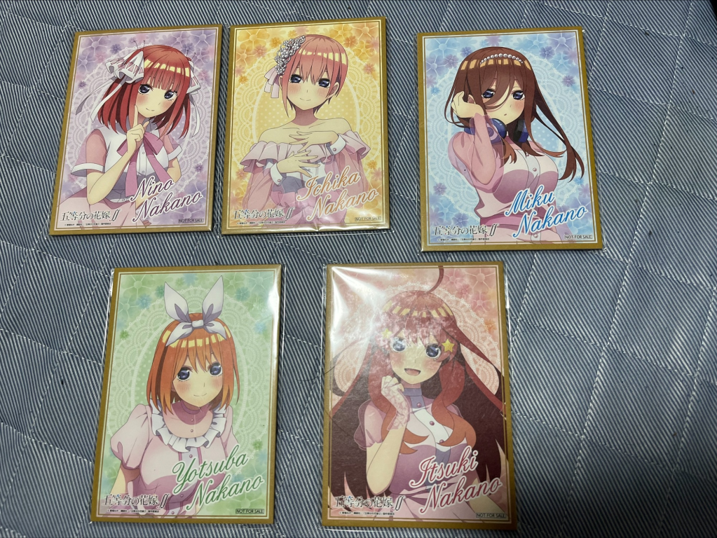 大人気作品!五等分の花嫁です~当時、二期がリアルタイムで追っていたので私は見ていました。二期は修学旅行編であり、原作でもすごく盛り上がりをみせてくれた、と耳にしたことがあります。まさか、あの子があの行動に出るとは(ネタバレなので今回は何も言いません) 因みにローソンともコラボしていたので家から遠く離れてたけどメチャ回りまくって五人分集めましたよ(笑)